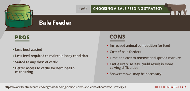 Bale feeding is common across Canada for all classes of cattle especially during winter months. There are many different management strategies to deliver bales as feed. To help you determine the best option for you and your cattle, see below for pros and cons of three common bale feeding strategies: